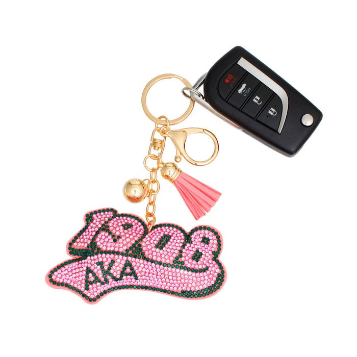 Show your Alpha Kappa Alpha pride with our stylish Wholesale AKA Sorority 1908 Pink Padded Keychain Clip. This elegant accessory features a gold metal base adorned with pink and green rhinestones, proudly displaying the "1908" and AKA initials. The padded keychain is backed with soft pink felt and includes a delightful pink tassel, adding a touch of flair to your everyday essentials. Measuring 2.25" x 3.5", it's perfect as a keychain or handbag charm, making it a chic and practical way to showcase your sorority spirit.