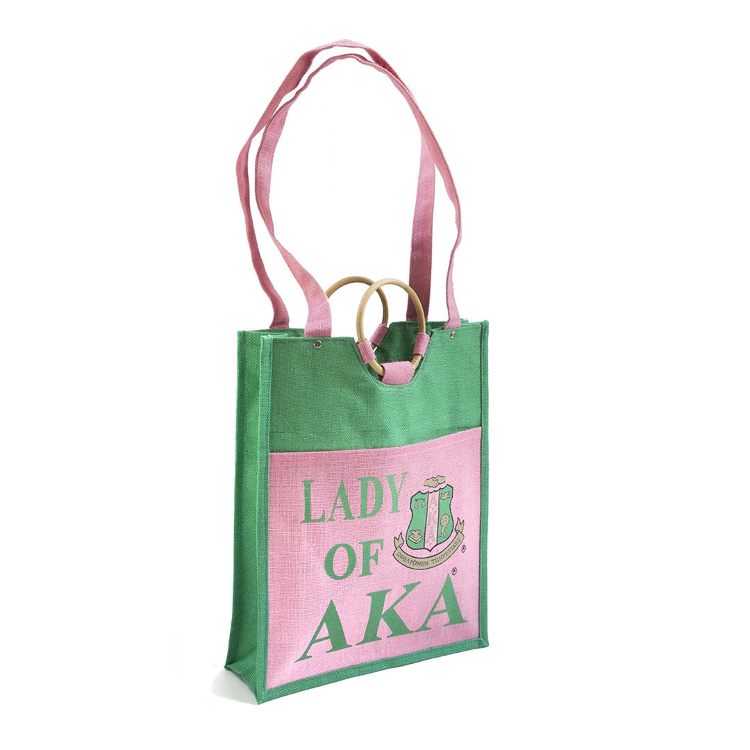 This Alpha Kappa Alpha Pocket Jute Bag features a Lady of Signature design and measures 14" w x 18" h x 5" to provide ample space for your belongings. With its durable jute material and convenient pocket feature, this bag is perfect for everyday use and proudly displays your affiliation with the renowned sorority.