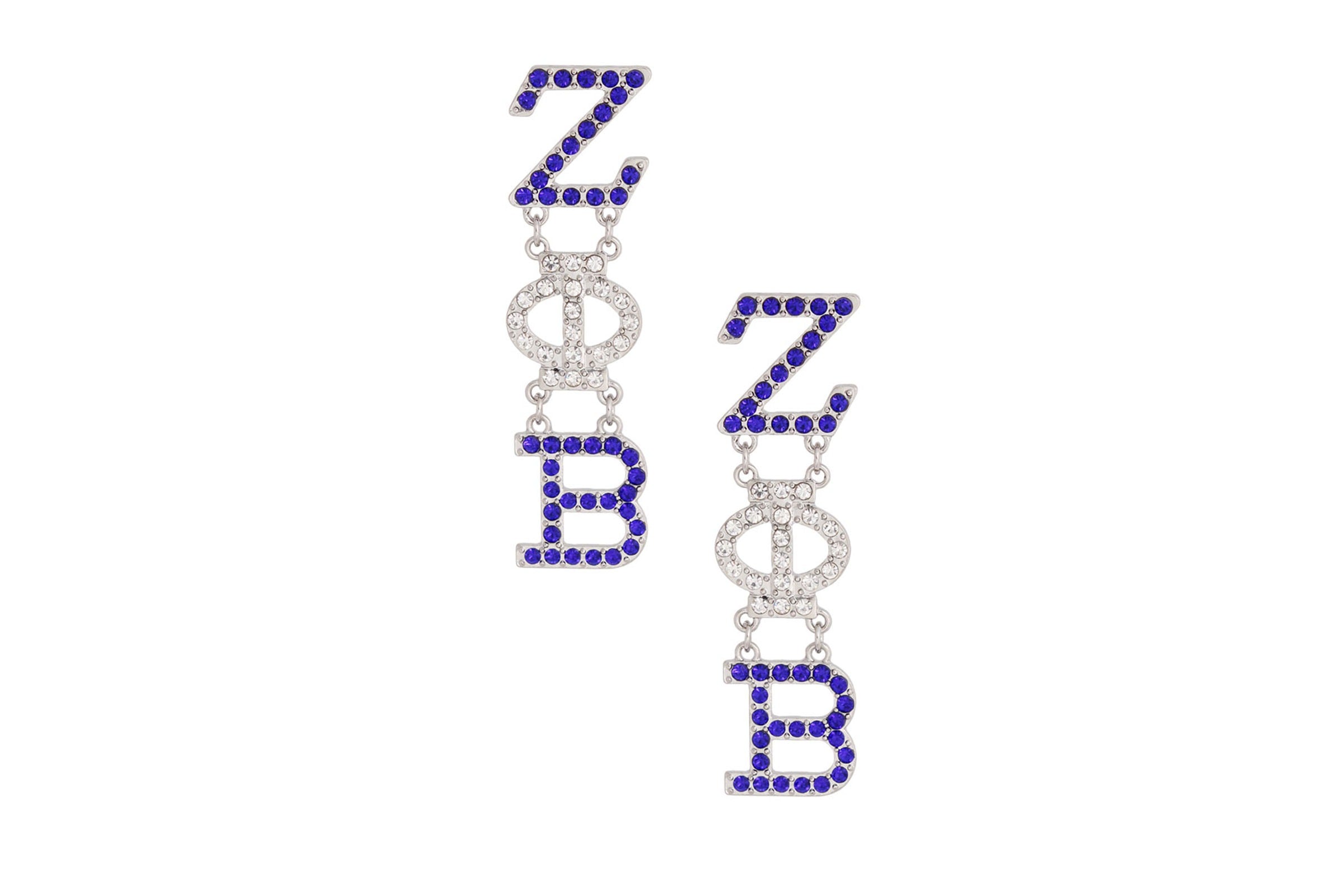 Silver Metal Stud Post Earrings Featuring Sorority Inspired Blue and Clear Rhinestone Greek Letter Dangle Drop. Earrings measure .75 inches wide.